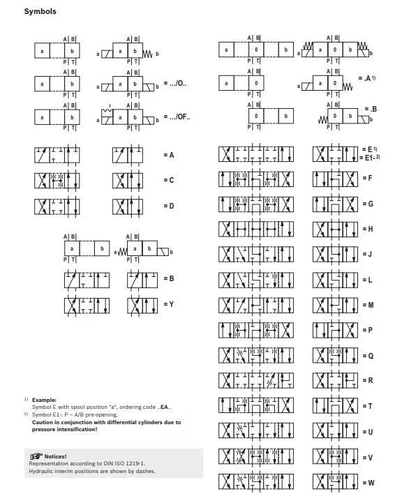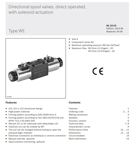 Directional valves type WE are solenoid operated directional spool valves. They control the start, stop, and direction of a flow. These directional valves basically consist of housing; one or two solenoids; control spool; and no, one, or two return springs. A full array of spools are possible with variations in voltage and electrical connection, all within the program. Flow and pressure rates from 4000 PSI to 5000 PSI and 21 GPM to 32 GPM cover a wide range of applications.