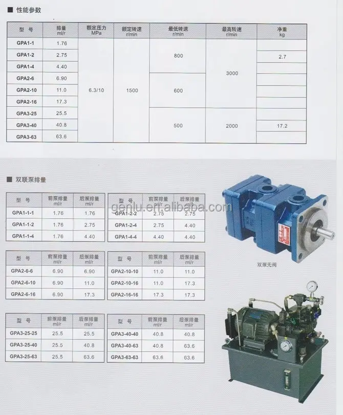 GPA low noise internal gear pump is manufactured by introducing the technology of American Vickers company. The products are divided into two series: single pump and double pump. The displacement of single pump is 1.76 ~ 63.6ml/r. There are nine specifications. According to different displacement, it can be combined into multiple specifications of double pump.