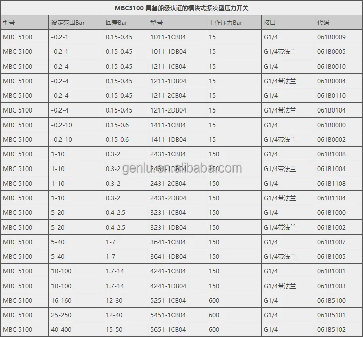 MBC pressure switches are suitable for offshore applications where space and reliability requirements need to be considered. MBC pressure switches have a compact structure, and based on our latest modular design, they can resist all kinds of harsh conditions in the ship’s mechanical cabin. MBC is highly vibration resistant and has been certified for all common offshore applications. The backlash is fixed, but it is very small, which can ensure the accurate monitoring of the key pressure. MBV test valves are available as standard options for MBC pressure switches. Certified for all relevant offshore applications, pressure range: – 0.2 to 400 bar, low return differential (fixed) micro switch, shock resistant, vibration resistant, IP65 protection rating diaphragm type, compact design for applications with pulsation / pressure peak, low installation cost, quick and easy operation, easy installation on test valve block, differential pressure switch availablePressure range: – 0.2 to 400 bar